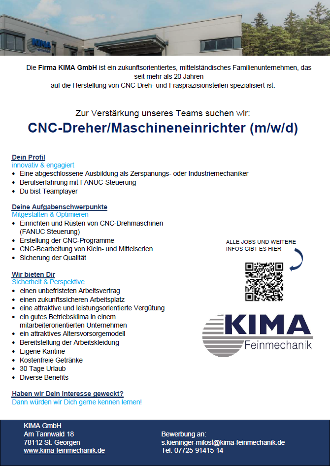 Die Firma KIMA GmbH ist ein mittelständisches familiengeführtes Unternehmen, spezialisiert auf die Herstellung von Dreh- und Frästeilen.
